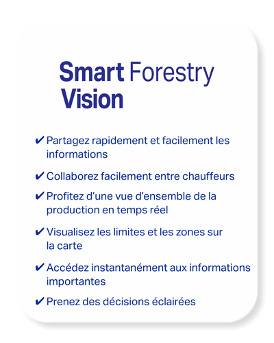 Smart Forestry vous donne accès à une collection de services numériques qui vous aident à profiter d’un lieu de travail sûr, intelligent, productif et durable - que vous ayez une ou cent machines forestières. Vous pouvez suivre vos machines, collaborer avec vos collègues et prendre des décisions judicieuses basées sur des faits.